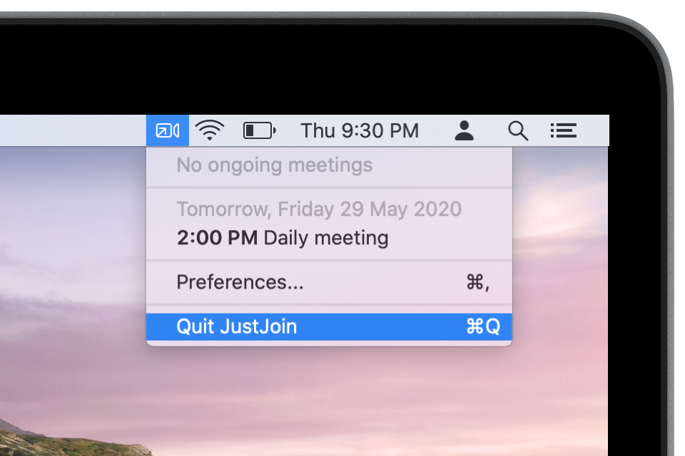 In the menu bar, look for the JustJoin icon, it is the tiny camera icon with an arrow in it. It should be next to the clock, the Wi-Fi status, the audio volume, etc. Click on it to open the app menu and select Quit JustJoin.